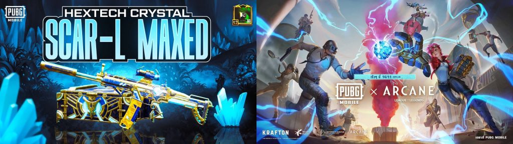 เป็นสกินที่ PUBG Mobile ร่วมมือกับ Arcane ซีรีส์ Netflix ที่ดัดแปลงมาจากเกม League of Legends โดยสกิน Hextech Crystal Scar-L สามารถอัพเกรดได้ถึงระดับ 7 สกินสไตล์สตีมพังค์นี้โดดเด่นด้วยเฉดสีฟ้าและสีทองที่ให้ความรู้สึกหรูหรา โดยสอดคล้องกับธีมของฉากลึกลับใน Piltover และ Zune ซึ่งเป็นพื้นที่ที่ขึ้นชื่อเรื่องเทคโนโลยี “Hextech” โดยสกิน Hextech Crystal Scar-L เปิดตัวไปเมื่อวันที่ 9 พฤศจิกายน ปี 2021