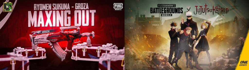 การร่วมมือระหว่าง PUBG Mobile x Jujutsu Kaisen โดย Ryomen Sukuna Groza สามารถอัพเกรดได้ถึงระดับ 7 และเป็น Skin ที่ต้องใช้ UC เยอะพอสมควรในการอัพเกรด และการอัพเกรดถึงขั้นสุดท้าย ตัว Ryomen Sukuna Groza จะมีดวงตาสีแดงเพลิงดูร้อนแรง และพิเศษสุดๆ