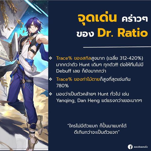 แต่เมื่อคิดทุกอย่างออกมาแล้ว ไอ้ Trace% 420% ของ Dr. Ratio มันก็โคตรเว่อร์อยู่ดี ทำให้เป็นตัวที่ Powercreep Yanqing, Dan Heng กันพอสมควร (แบบยังไม่คิดเรื่องต้านทานธาตุ)