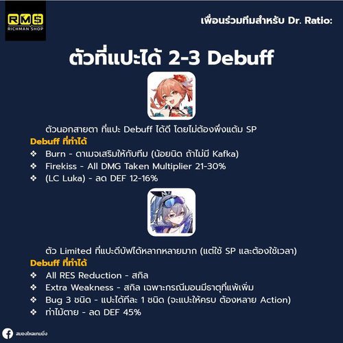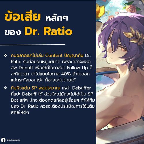 เป็นอีก 1 การตอกย้ำ ความสามารถในการรับมือมอนหมู่ที่แย่มากของเขา เพราะการที่สกิลของ Dr. Ratio จะทำงานได้เต็ม 100% ก็ต้องอาศัยการ setup Debuff ของเพื่อนร่วมทีมด้วย = ใช้เวลา ใช้ Action เยอะ
