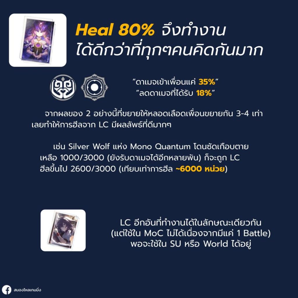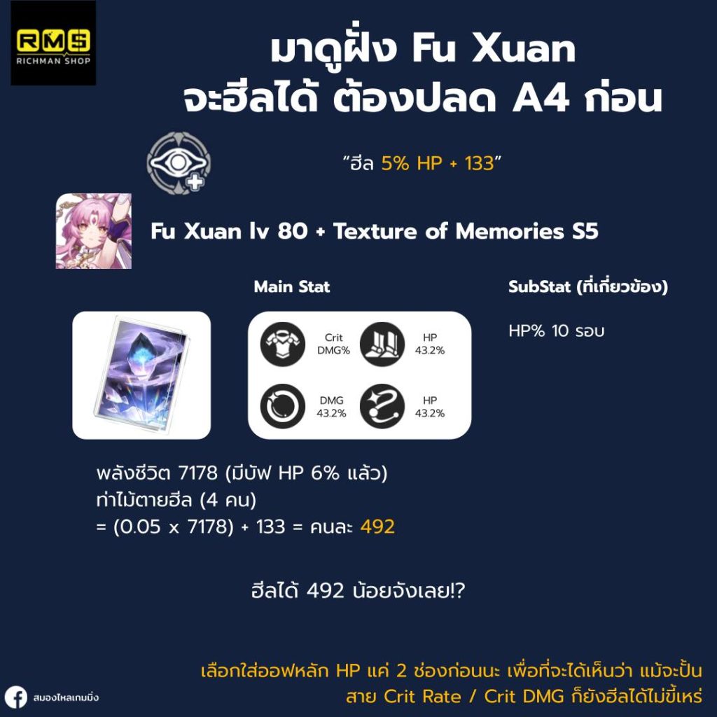 (พลังชีวิต x % HPหรือ 0.05)+ 133 = คนละ 492 จะเห็นได้ว่า การเลือกใส่ออฟหลัง HP แค่ 2 ช่องก่อน เพื่อที่จะได้เห็นว่า การปั้น Fu Xuan สาย Crit rate / Crit DMG ก็ยังฮีลได้เพียงแค่เล็กน้อยเท่านั้น